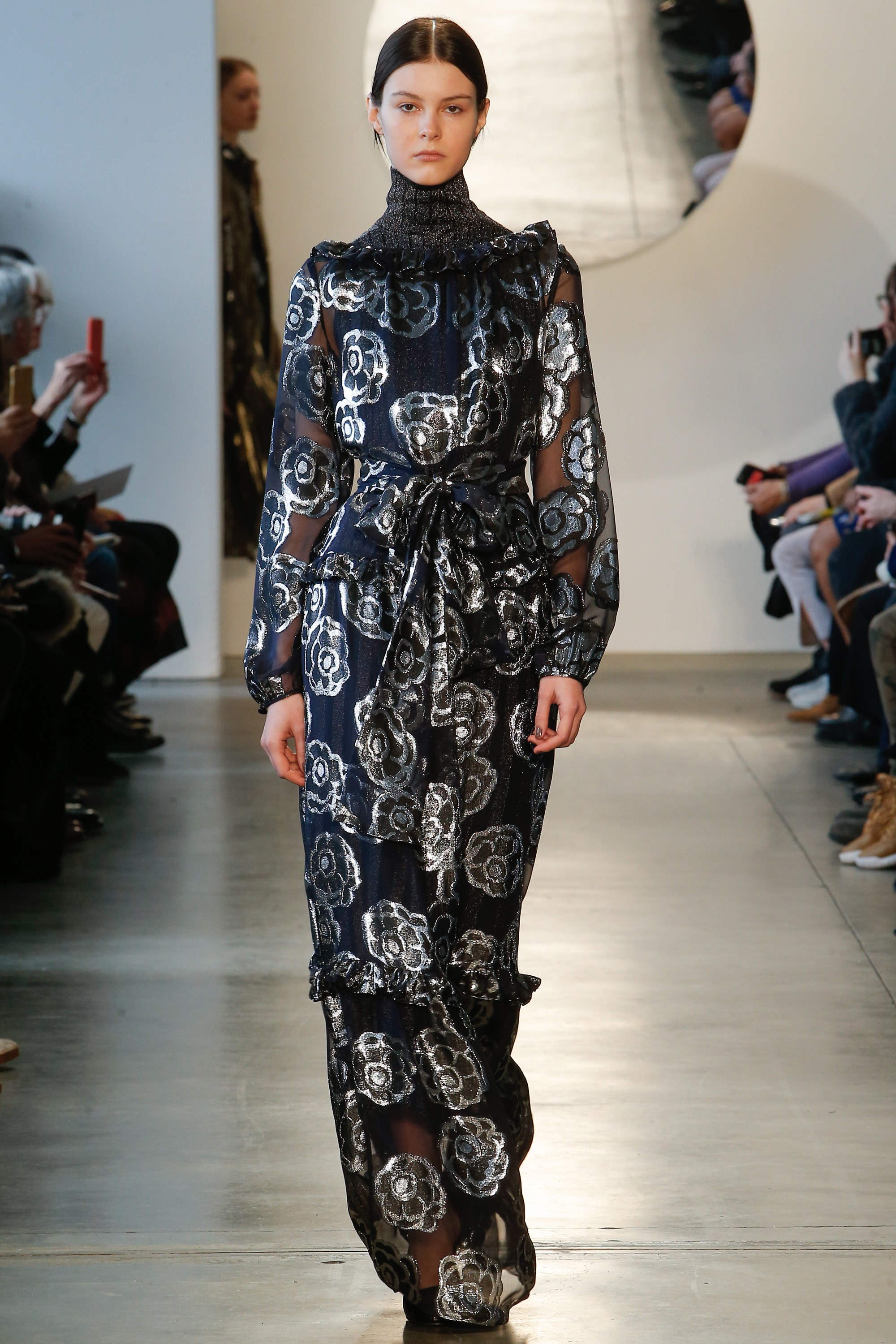 The dress features metallic silver floral brocades throughout with a sheer overlay on the full-length arms, paired on top of a matching blue slip.