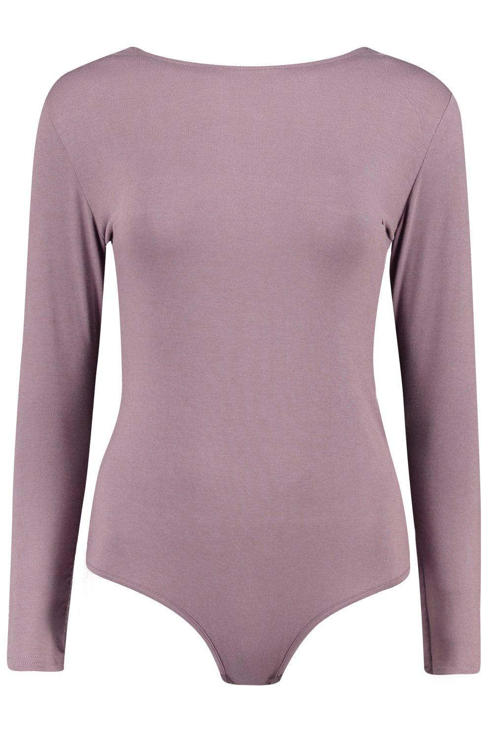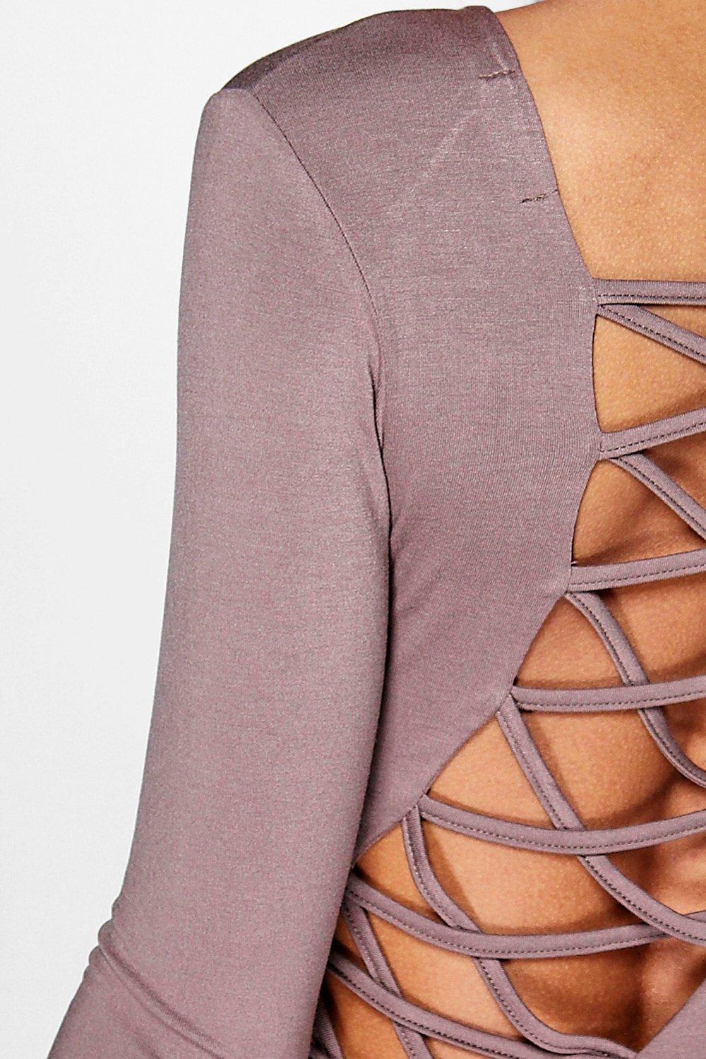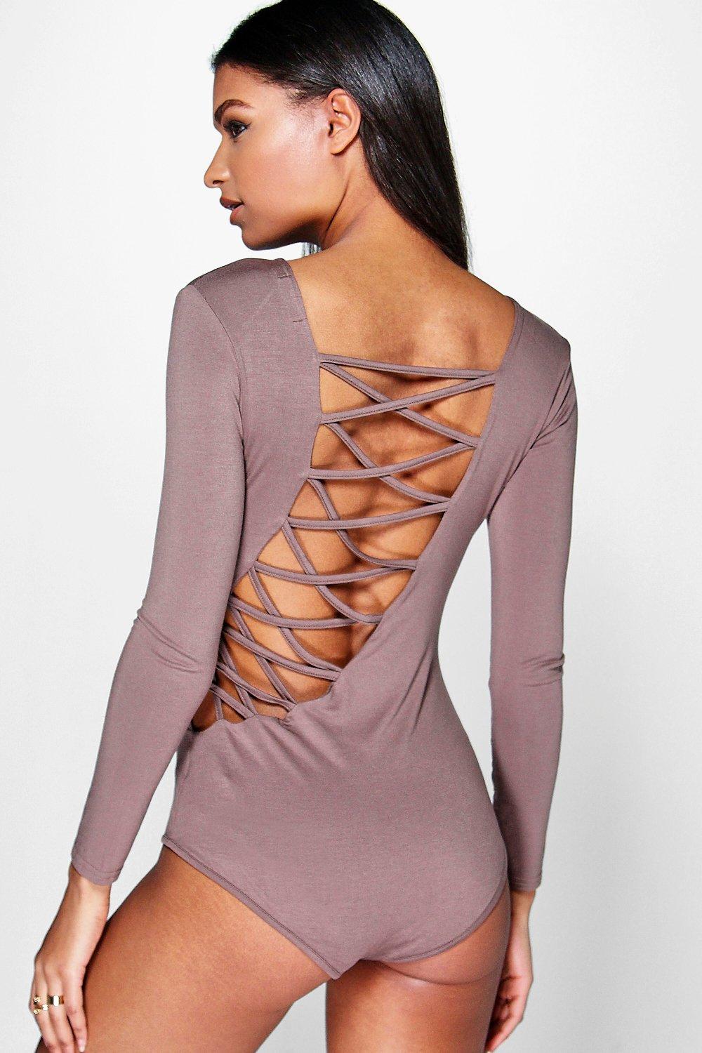 The long sleeve, mocha colored bodysuit features an asymmetrical cross-lace detailing on the back.