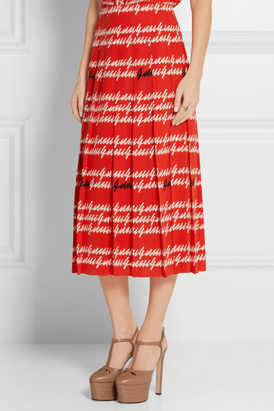 Chic print alert! Gucci has been synonymous with all things fresh and chic. Their popular Spring 2016 $1,890 Red Cursive Ivory And Black Printed Pleated Skirt and $1,390 Matching Shirt is a testament to that statement. Celebrities simply love ’em!