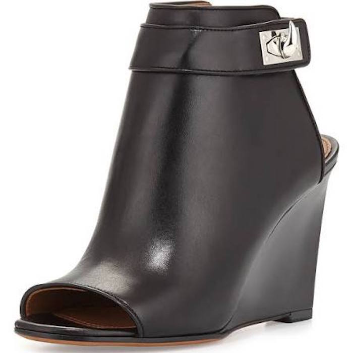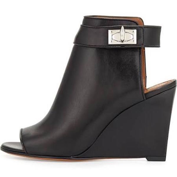 Her Italian made leather ankle booties boast 3.5″ covered wedge, a 6″ boot height, an open toe and cut out heel.