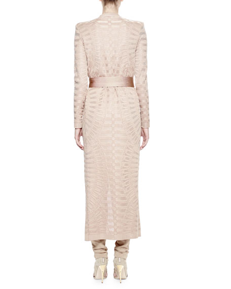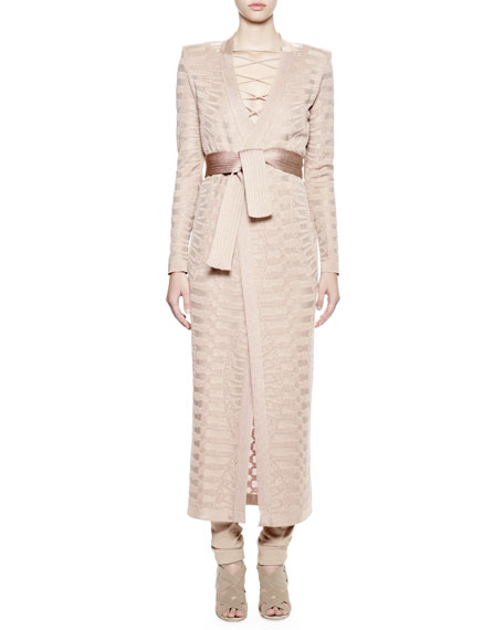 The collarless Balmain knit duster features long sleeves and an open front, accessorized with an attached belt for closure.