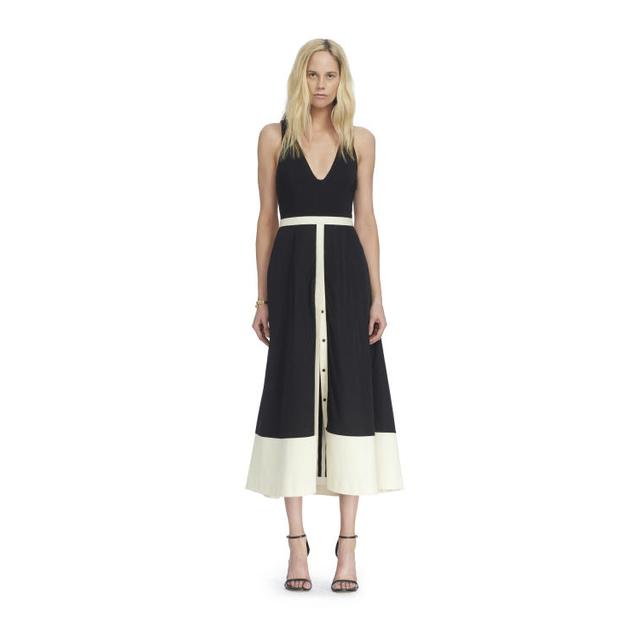 Her black and white frock features side-seam pockets, a tech jersey bodice, and a cotton skirt. It was made in NYC.