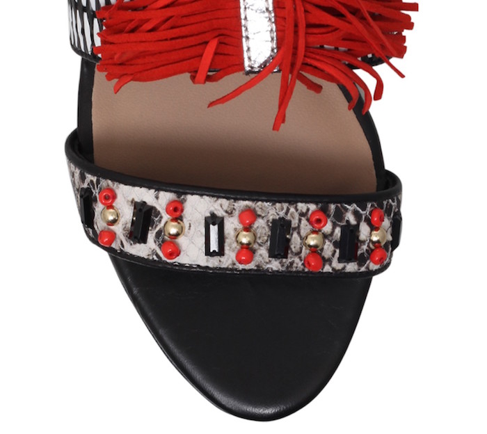 Her eye-catching knee-high stompers features a leather-blend lace-through upper with tassels, striped and beaded detail.