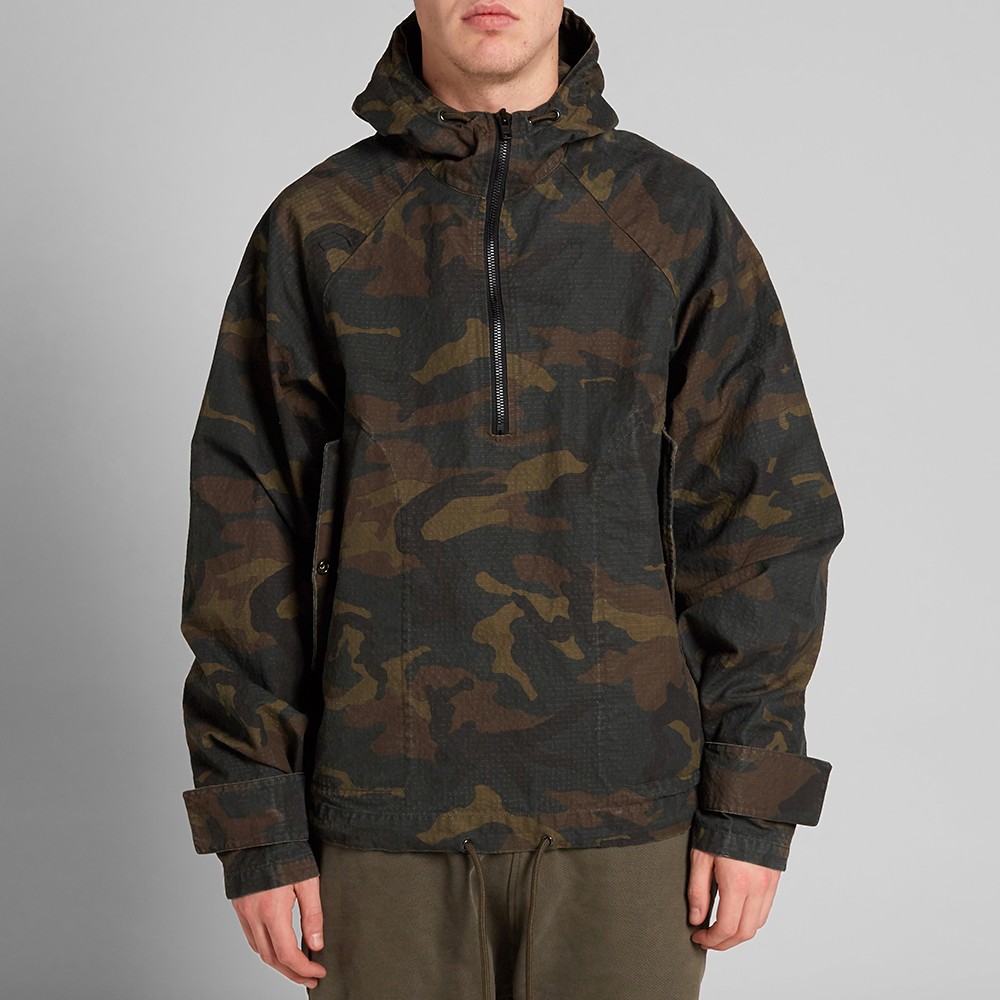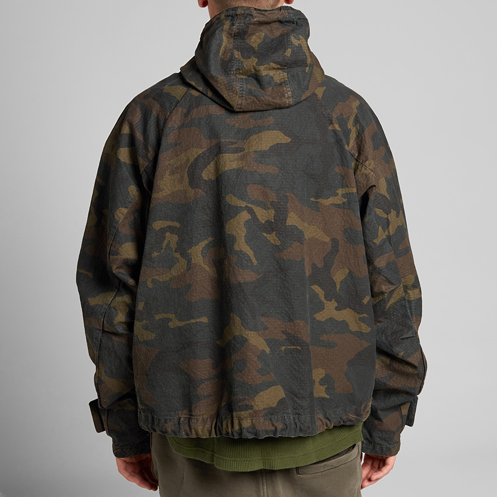 The textured, long sleeve, lightweight canvas jacket features a green and brown camouflage pattern along with a drawstring at the hood and hem. The pull-over jacket has a zip closure at chest and flap pockets with press-stud fastening at the waist.