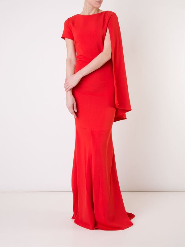 Her gown features asymmetric sleeves and a form-fitting silhouette. Here’s a comparable style from the brand.
