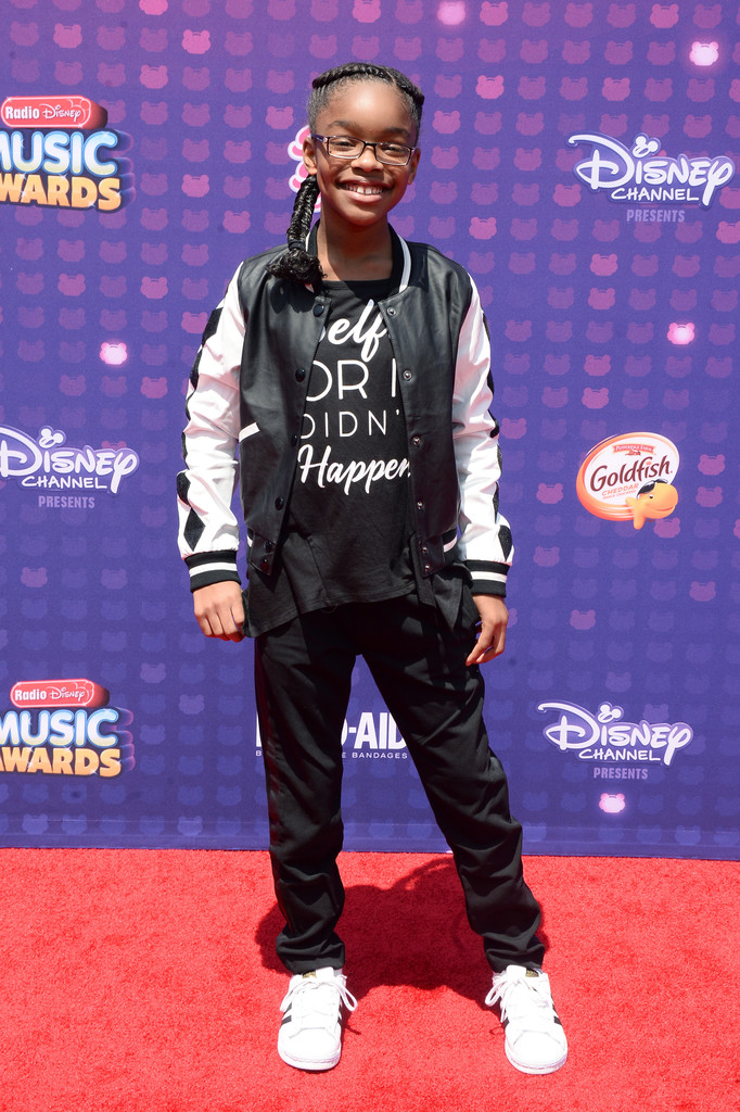 Her cutie costar Marsai Martin slipped a Varsity jacket over a Ten Sixty Sherman Selfie or It Didn’t Happen T-Shirt.