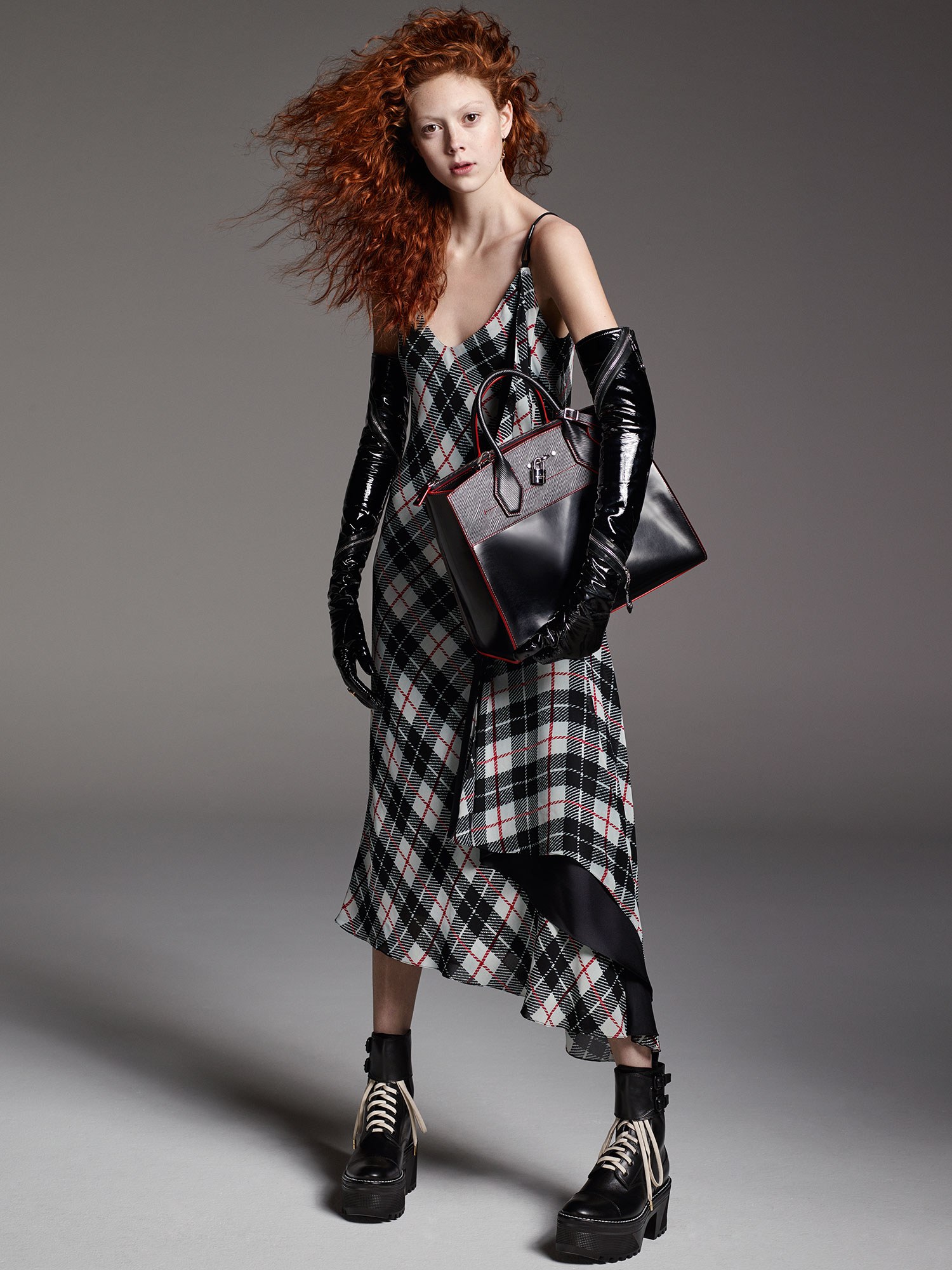Whether or not you’d like to admit it, grunge in fashion is becoming mainstream again, much to Nicolas Ghesquière’s delight. This dress, in particular, features a striking tartan plaid pattern in black, white, and thin lines of red. The hemline, cut on a bias, adds shape to what could’ve been a frock with a dowdy silhouette. And a slight peak at the lining adds a bit more flair to what could be perceived to be an overwhelming pattern. Sans shiny leather opera gloves and the huge tote as seen on the model, Swift opted for a small box clutch and hiking boots from the house’s fall 2016 collection.