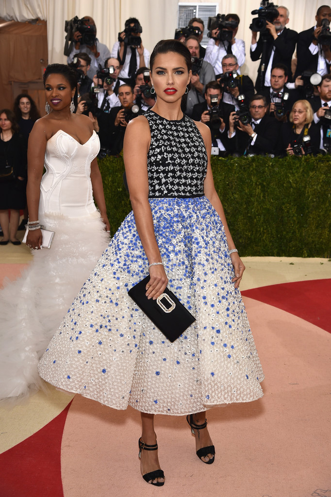 Adriana Lima usually opts for body-baring looks, thus her embellished Giambattista Valli midi flare dress was a nice change.