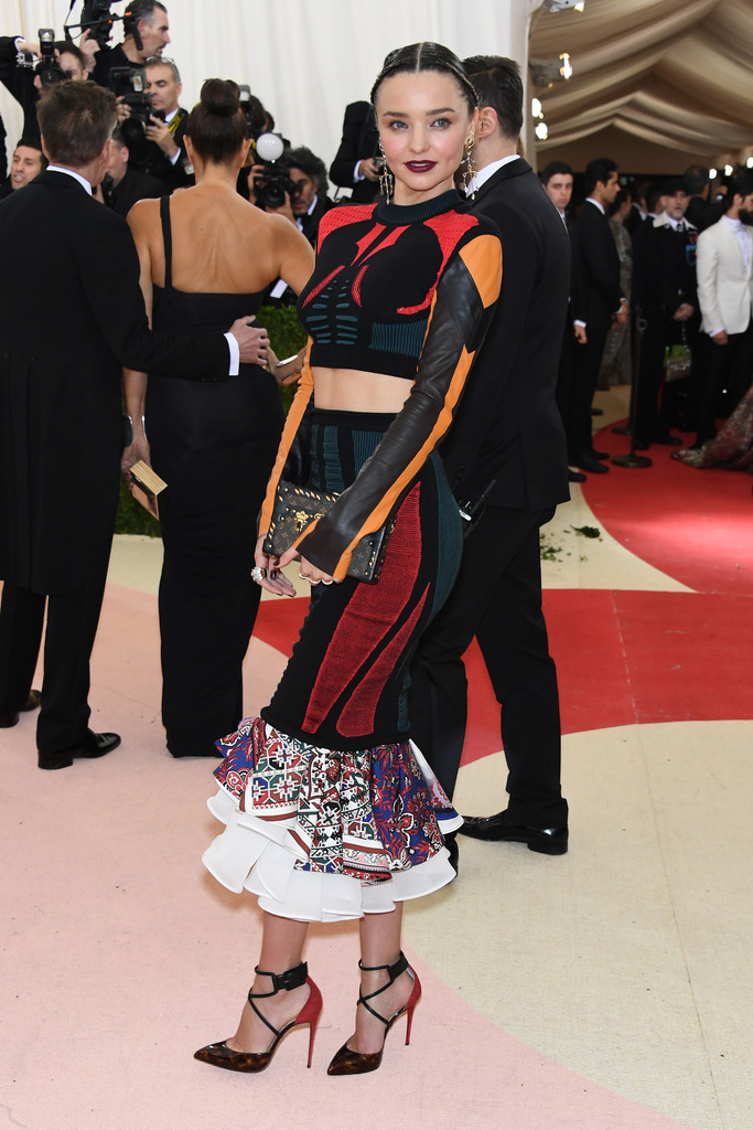 I didn’t think I would see the crop top and pencil skirt trend tonight, but lo and behold: Miranda Kerr showed up in the on-trend pairing! The two-piece was designed by Louis Vuitton, of course.