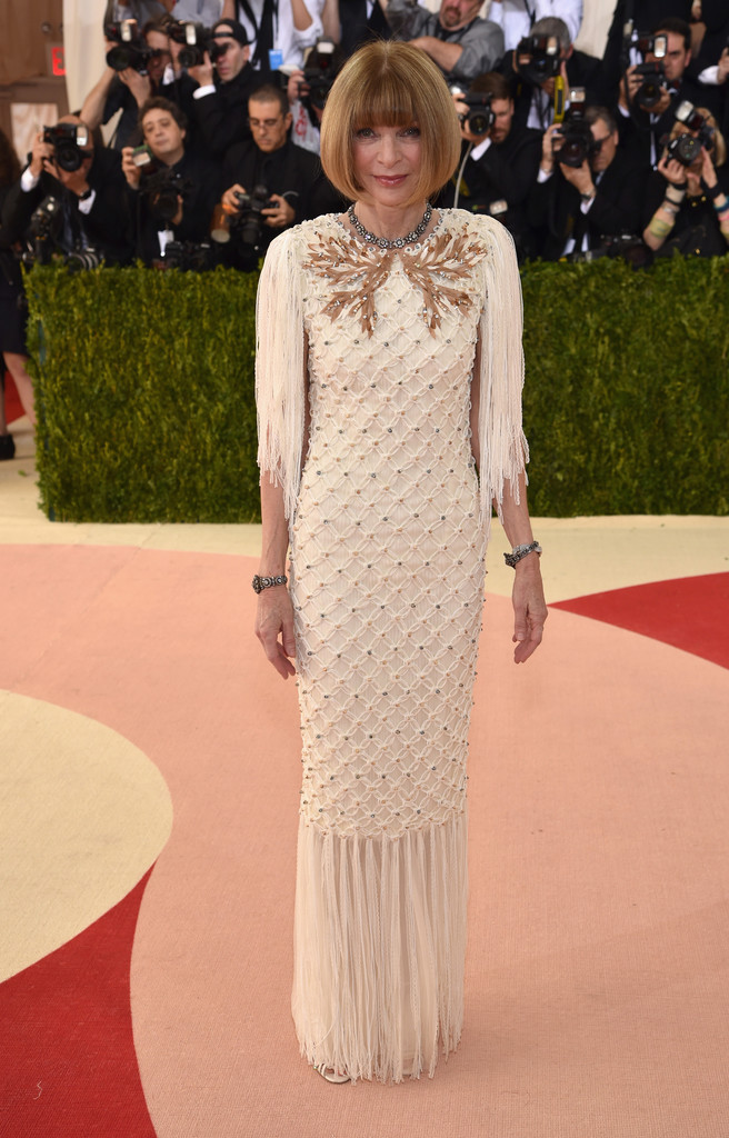 Anna Wintour was a vision in a white textured Chanel Couture gown with fringe embellishment and gold embroidery.
