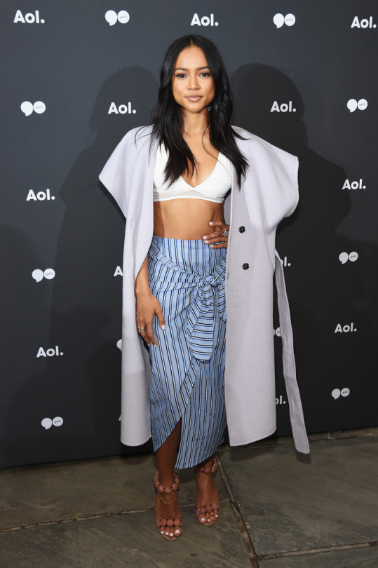 Karrueche Tran attended the AOL Upfronts in New York City in a $40 White Mesh Trim Bra, a $140 Boutique Striped skirt by the brand, and double breasted vest.