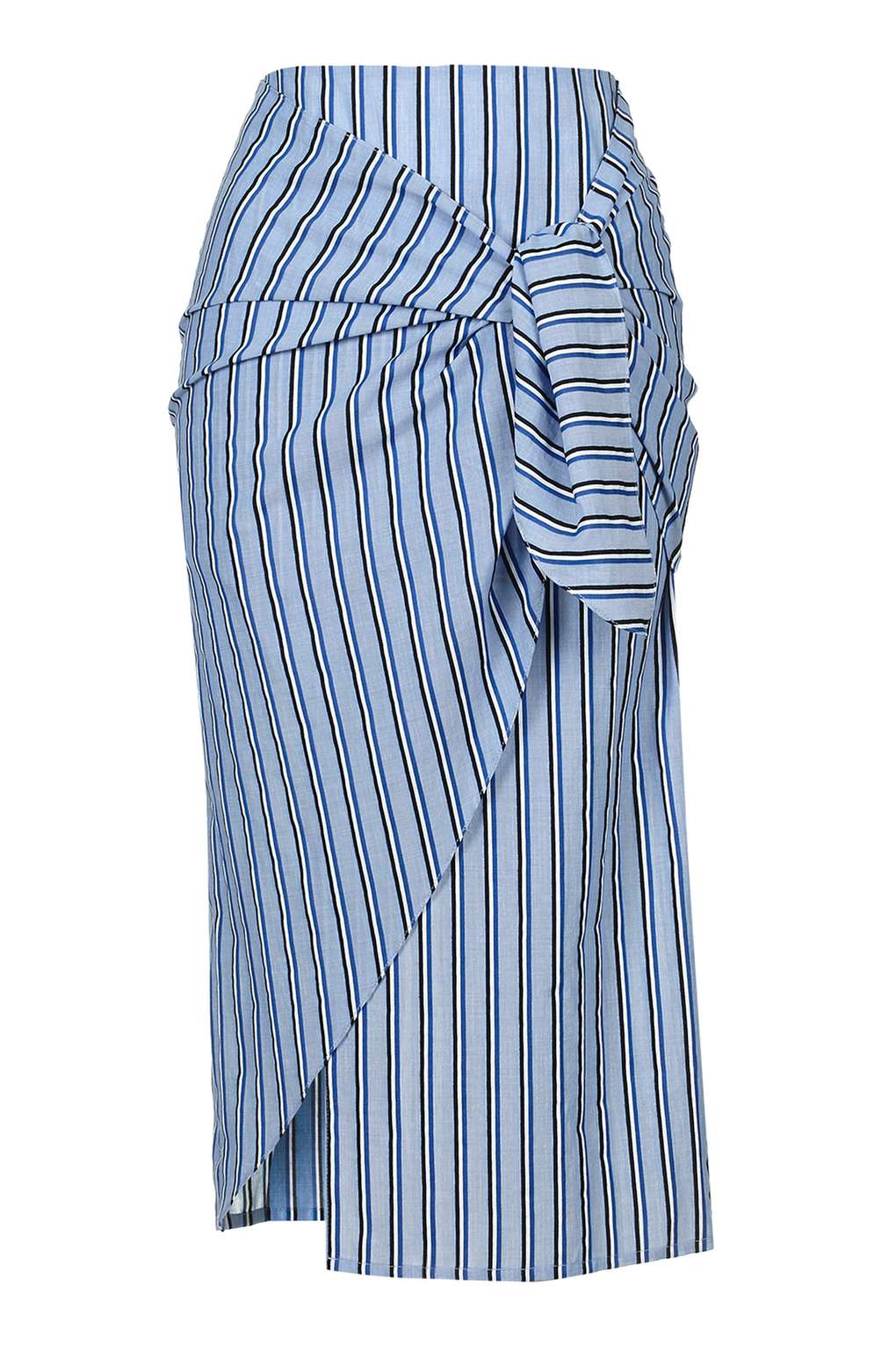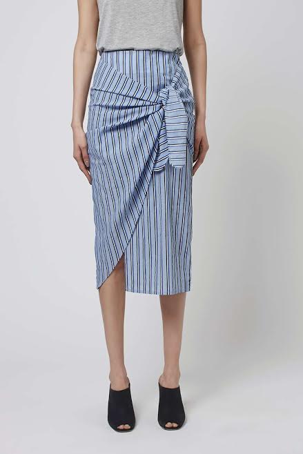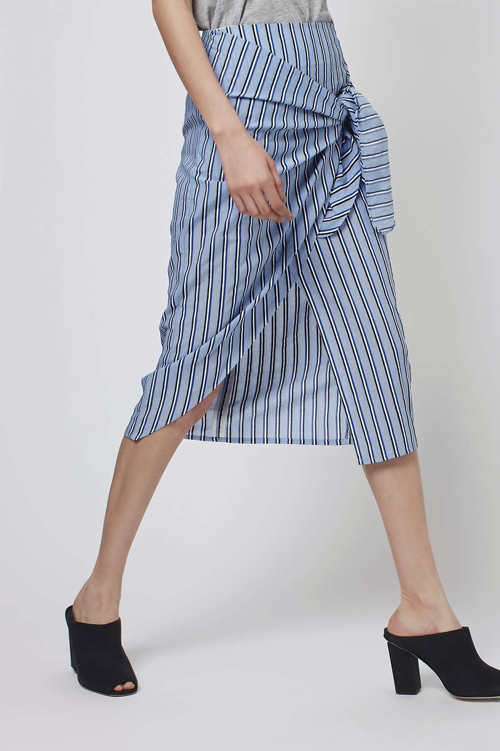 Her skirt has an exaggerated tie front detailing.