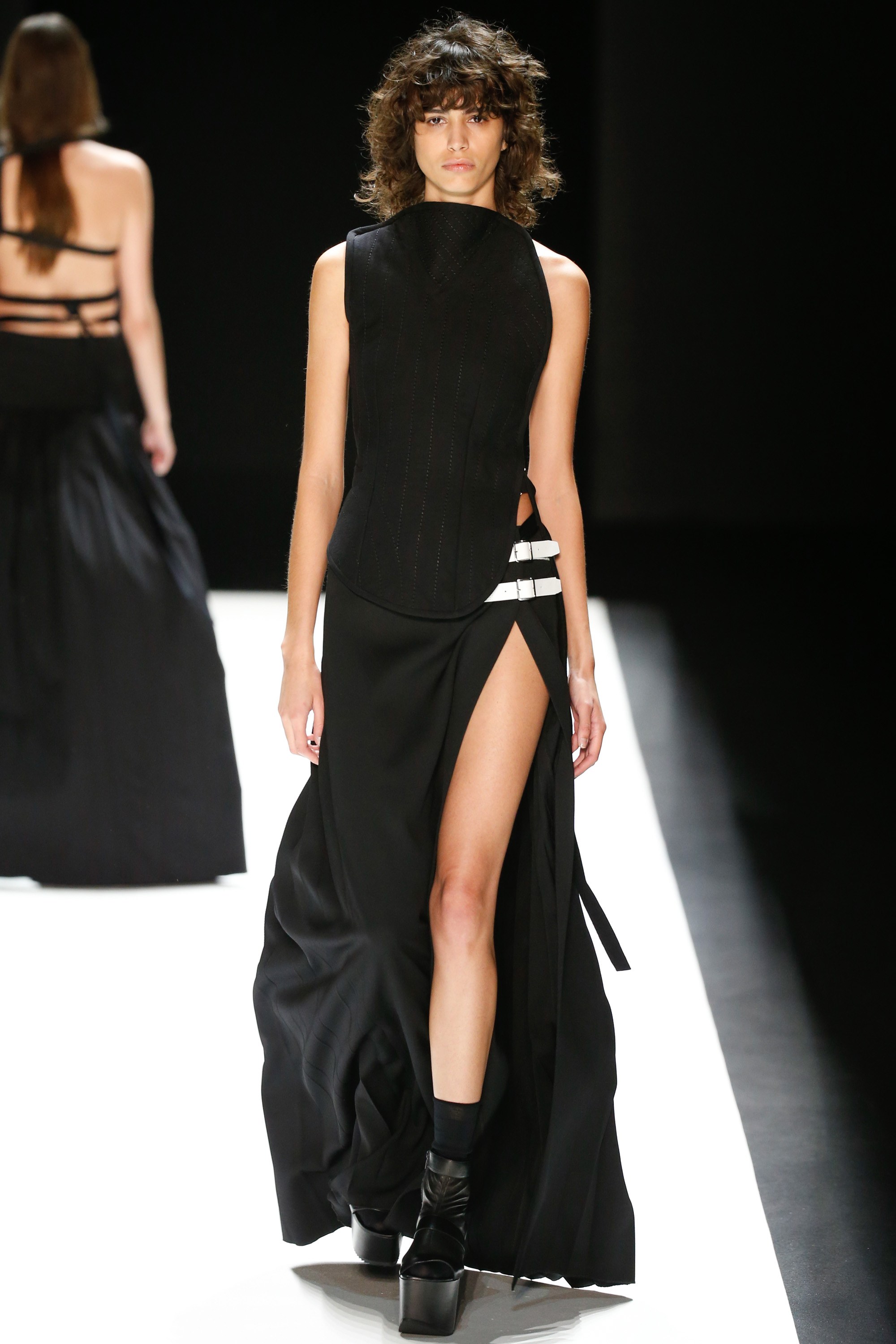 The pieces features a sultry split, contrasting textures and a low, cut-out back.