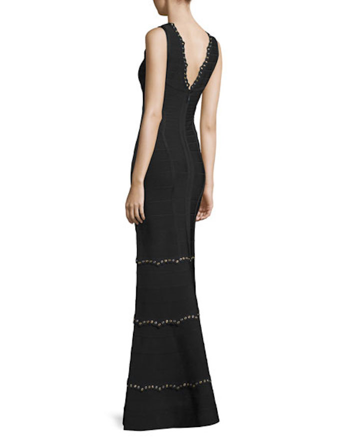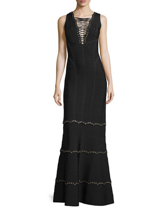 The brand’s signature bandage gown boasts silver-tone grommet trim and a plunging lace-up V-neckline at front.