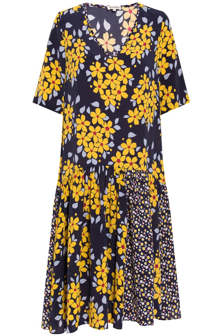 Her silk crepe de chine dress features contrast floral panels, a V-neck, shirred skirt, and dropped waist.