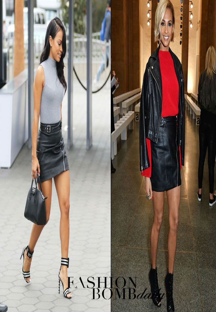 Karrueche paired the piece with a $30 Topshop Sleeveless Funnel Bodysuit, a $1,750 Givenchy Mini Antigona Bag, and Saint Laurent Paloma Sandals. Alesha chose a matching black leather biker jacket, $80 Compact Rib Funnel Top, and Givenchy peep-toe booties.