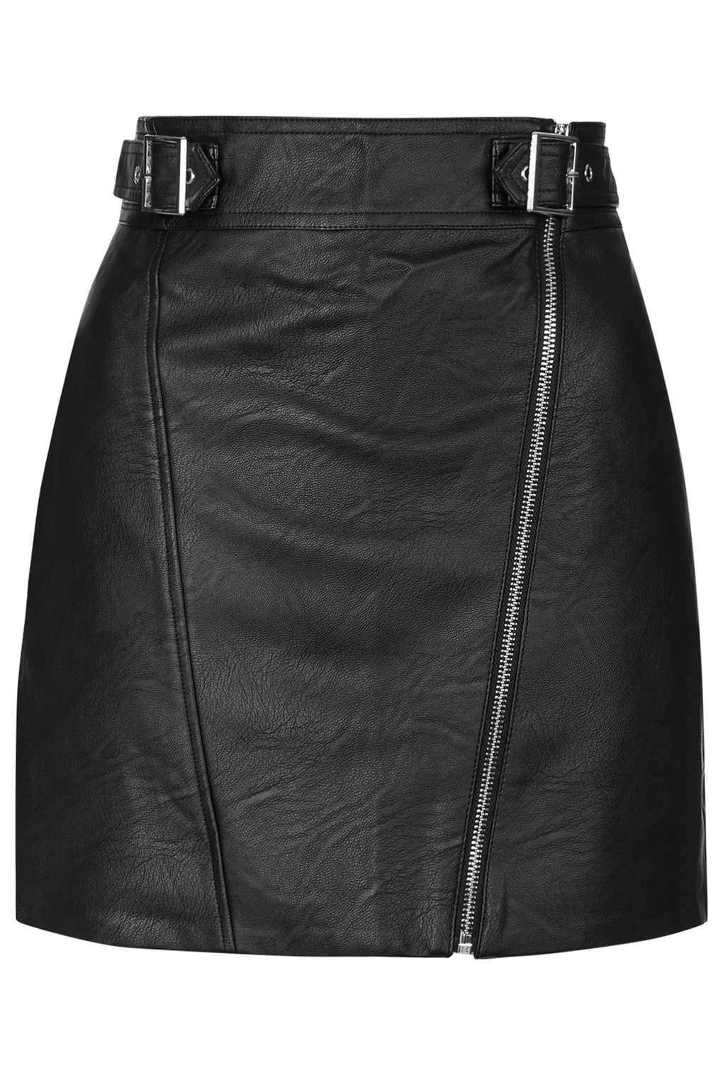 The leather-look biker skirt features an A-line silhouette, high waist, and zipper detailing.