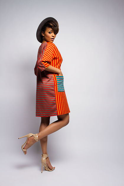 The box-silhouette dress features a horizontal and vertical stripe detail. Made of 100% cotton, the wide-sleeve dress has front pockets, one of which extends past the hem.
