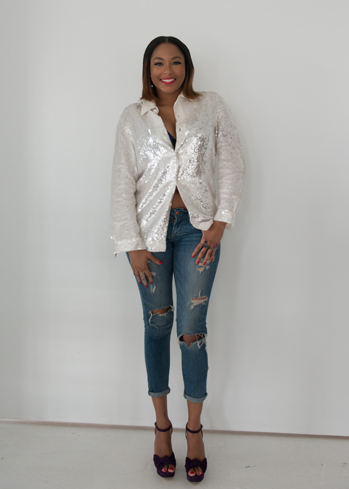 Alicia L. Quarles skewed sparkly in a sequined top, jeans, and bold platform sandals.