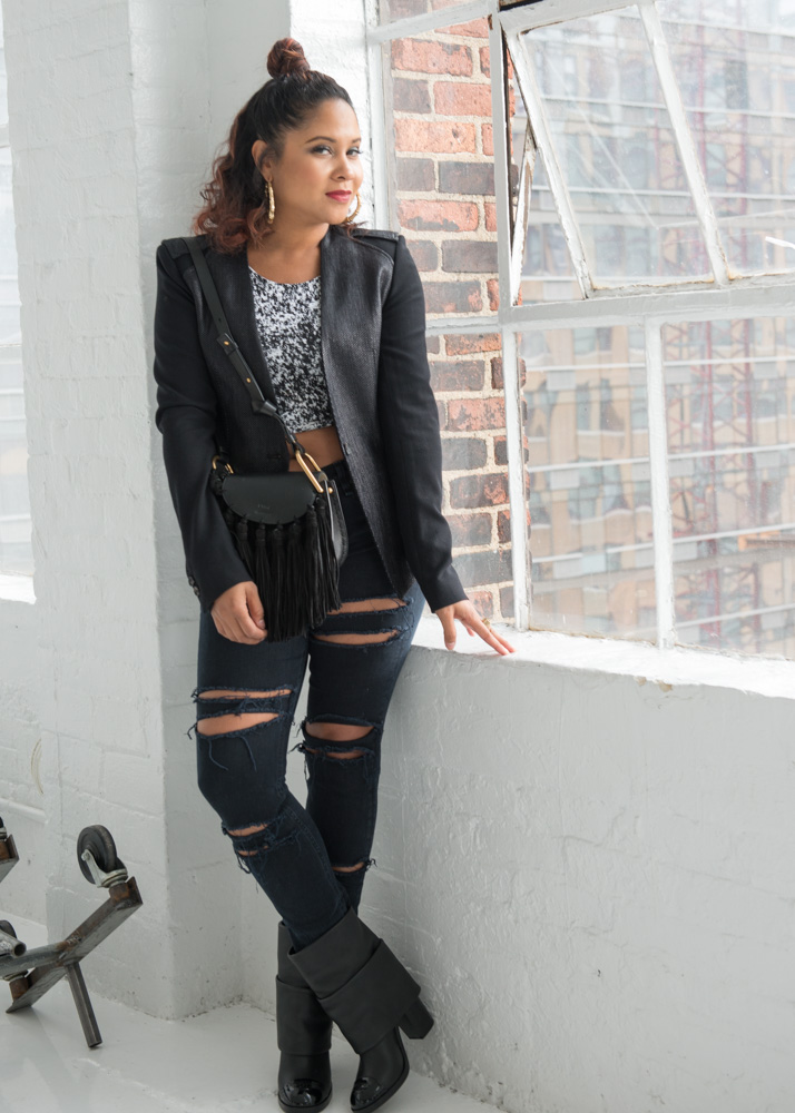 Angela Yee worked distressed jeans, a crop top, and blazer, along with a bomb Chloe fringed purse and Chanel boots.