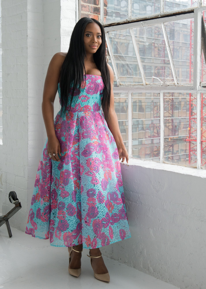 Yandy Smith was pretty in a strapless floral organza fit & flare dress by Monique L’huillier.