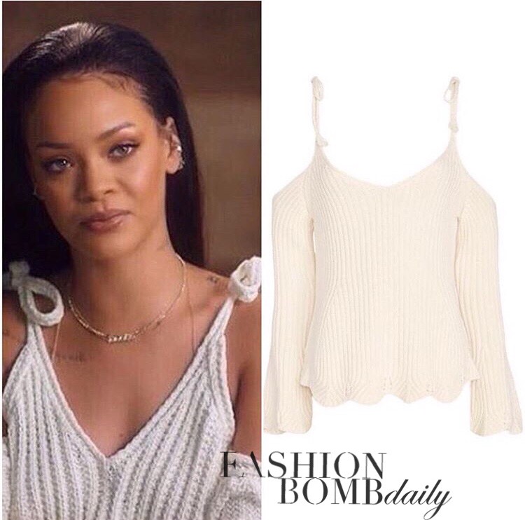 Just as much for her music and fashionable aesthetic, Rihanna is slowly becoming more and more known for her humanitarian work. The bajan beauty was recently in a video with her organization, Clara Lionel Foundation, wearing a $245 Intermix Chase Tie Strap Cream Shoulder Knit Top: