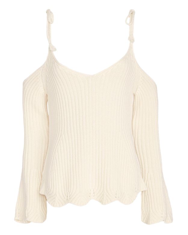 The shirt features cut-out shoulders with self tie straps. Along the hem’s edges you’ll find scalloped detailing and flared long sleeves.