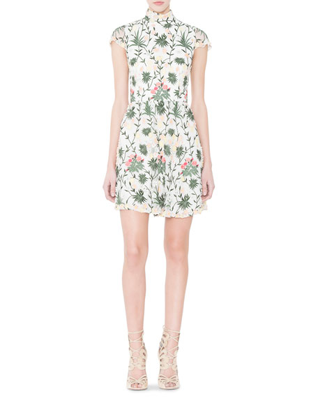 Her floral print dress boasts allover colorful embroidery, a mock neckline, cap sleeves, an A-line silhouette, and straight hem.