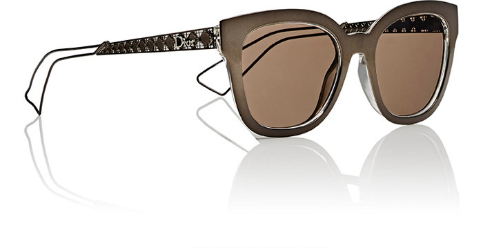 Her grey mirrored metal shades features a clear acetate layer, metal temples cut out in the iconic French fashion house’s signature Cannage motif, a rounded square shape, clear nose guards, and grey gradient lenses.