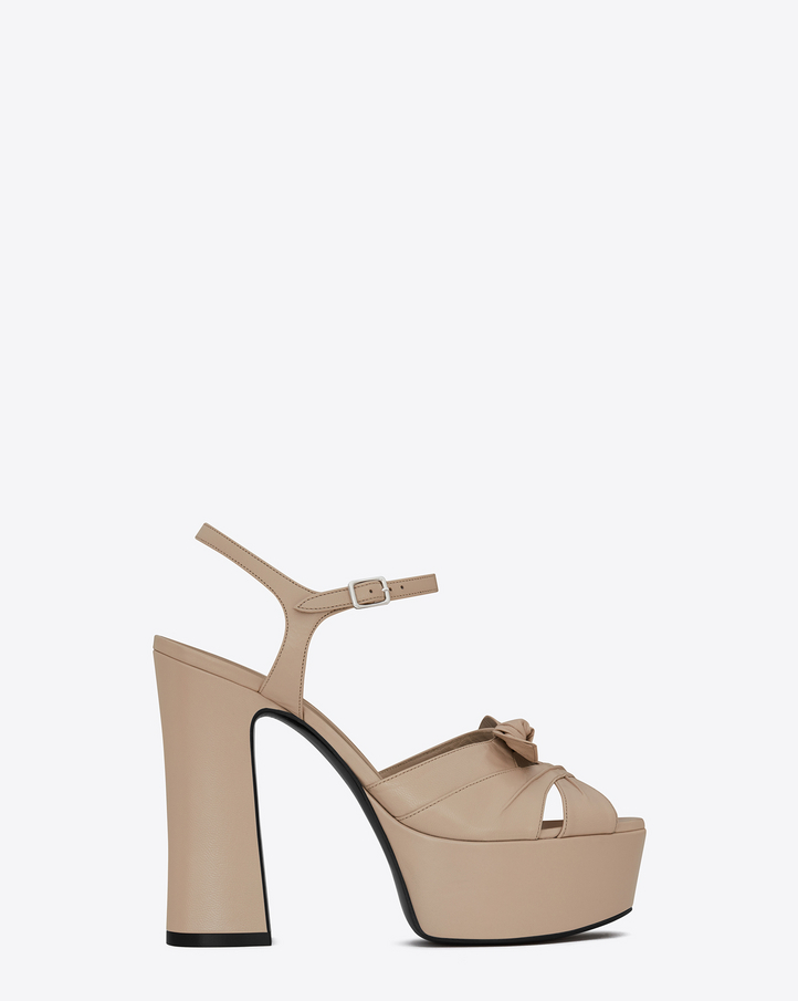 Her platform sandals feature chunky sky-high, 4.9″ heels, crisscross straps, and bow detailing.