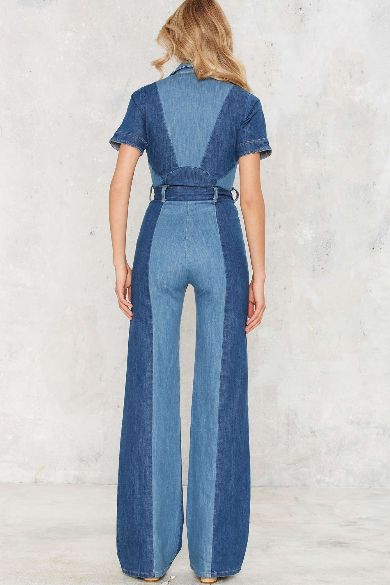 The ‘Blue Jean Baby’ Jumpsuit is crafted from blue salvage Italian denim and boasts contrast paneling of both dark and light hues.