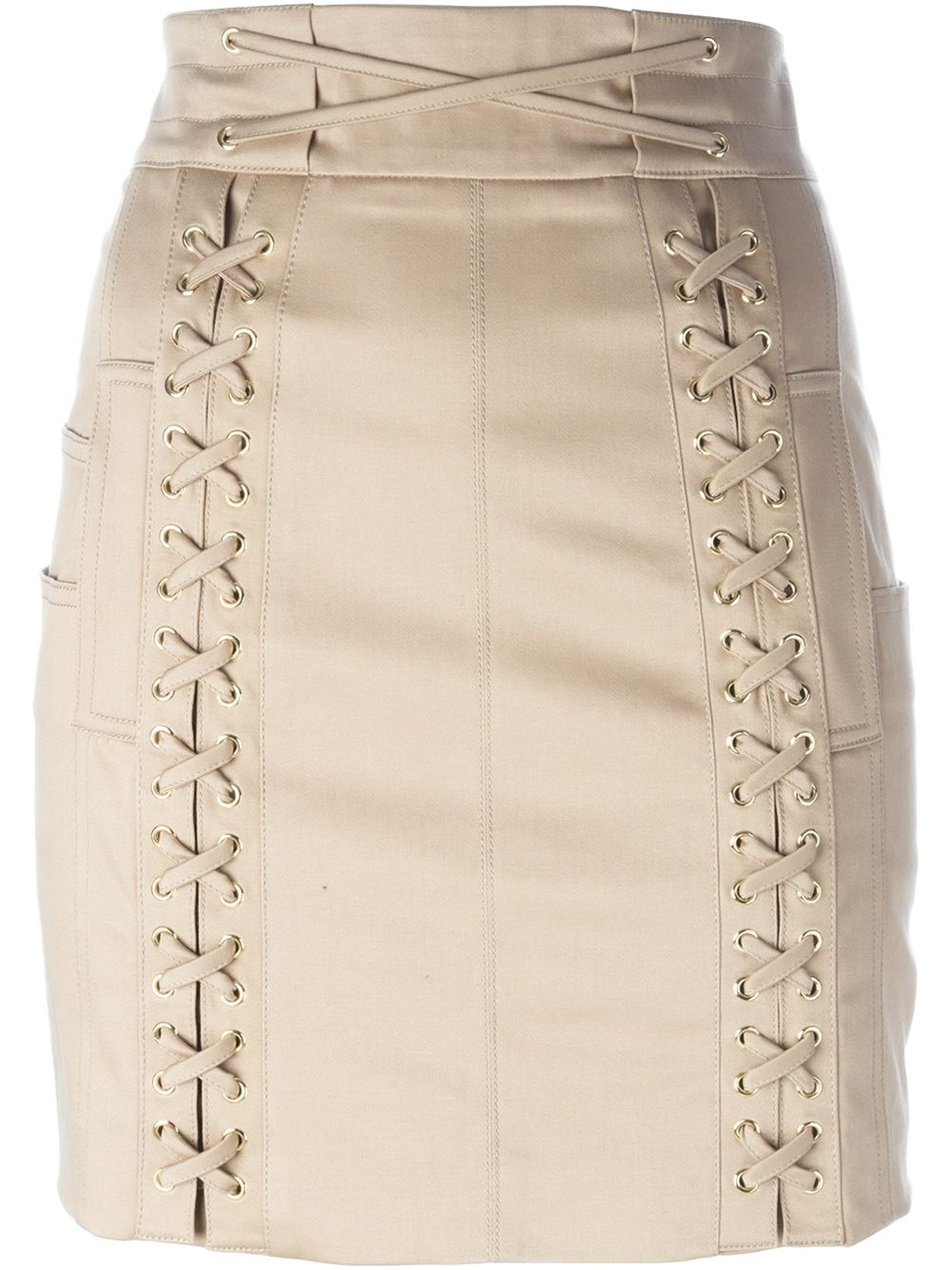 The $1,820 beige, stretch-cotton, lace fastening detail mini skirt features a high rise and a rear zip fastening.
