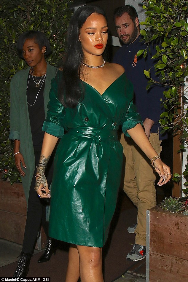 Rihanna took her mother out to eat on Mother’s Day rocking this beautiful $4,200 Nina Ricci green paper leather coat with a pair of Christian Louboutin ‘So Kate’ Brocart heels :