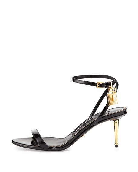 The heel features the signature yellow-gold hardware, sports a 2.5″ metallic heel and has thin strap bands around the open-toed area. As a cute detail, there’s a padlock and key charm that hangs at the ankle.