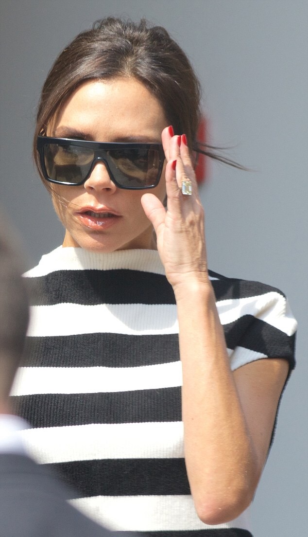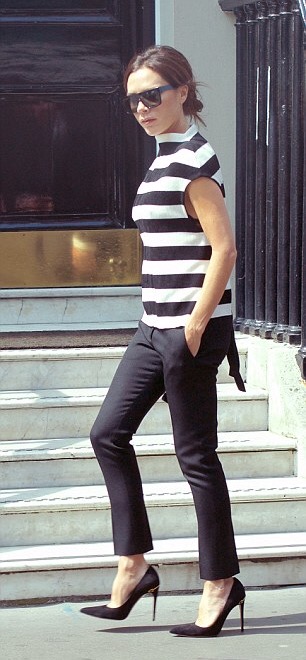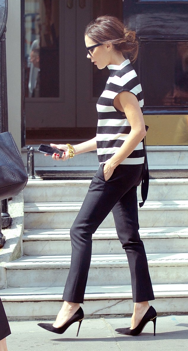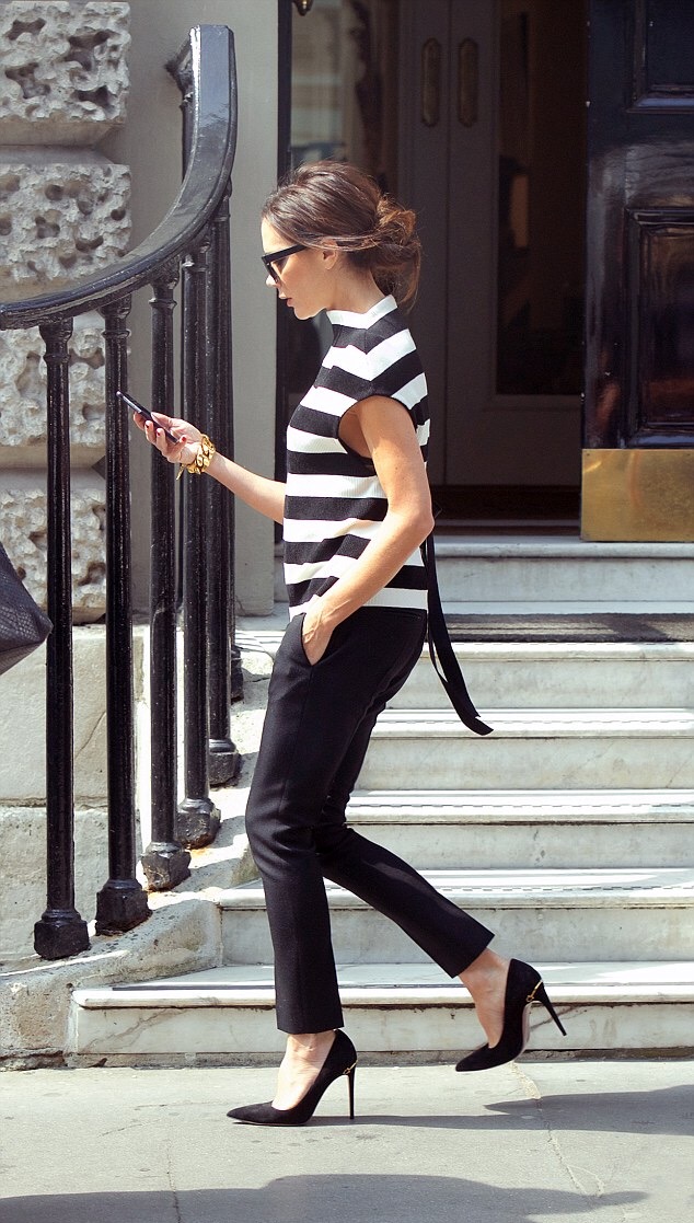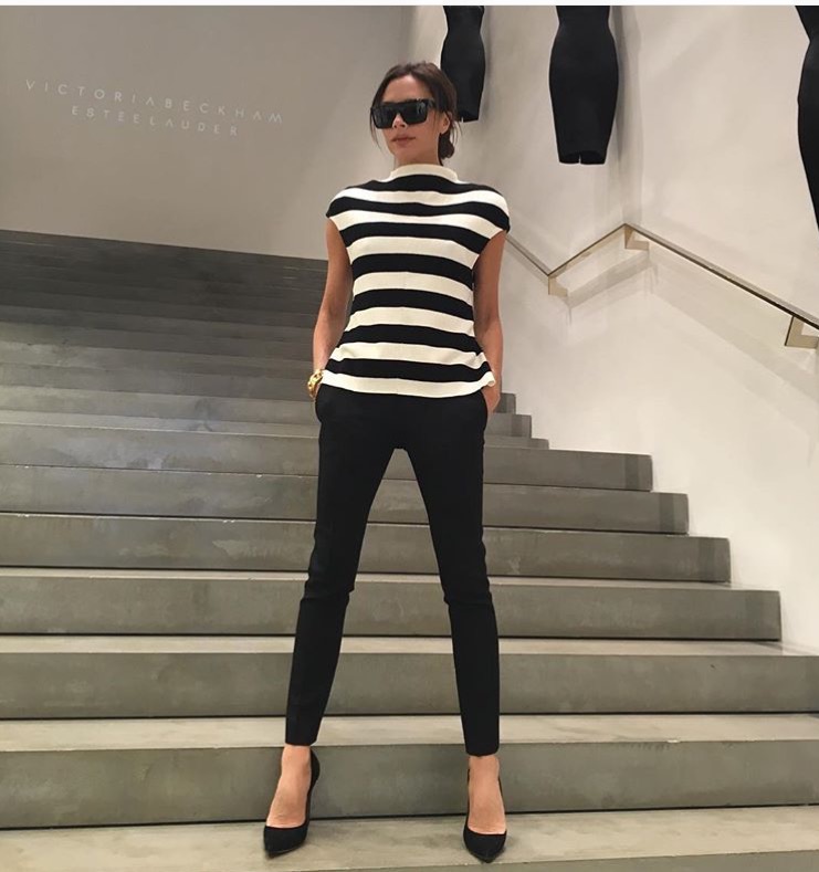 Designer Victoria Beckham was snapped while headed to The Art Club in Mayfair to prepare to celebrate the Estée Lauder makeup collaboration with her brand. Without a doubt, she stepped out in style, wearing pieces from her eponymous line, no less. She paired her $1,525 Victoria Beckham Striped Knitted Top with $1,190 Black Tuxedo Trousers along with a pair of $595 Gucci velvety black suede ‘Adina’ pumps: