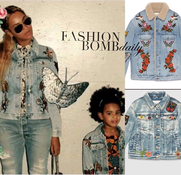 Lady Bey gave us a quick snippet video on Instagram posing with Blue Ivy in matching fashion. It appears like Beyonce was sporting a similar style to this $4,950 Gucci Denim jacket with Embroidery while little Blue was rocking the $860 children’s denim version: