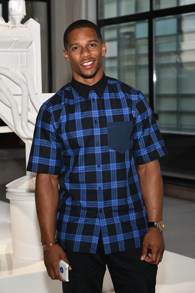 Victor Cruz attended the Jeff Koons x Google event the other day rocking a relaxed fit of black jeans and pairing it with a $655 Givenchy Blue plaid print boxy cut menswear top: