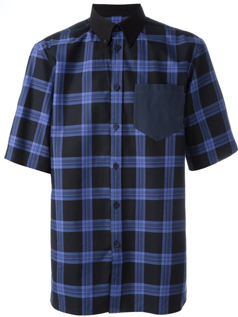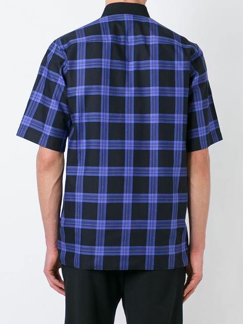 The black and blue cotton plaid print boxy shirt from Givenchy features a button down collar, a chest pocket, a front button placket, short sleeves, a plaid print and a straight hem.
