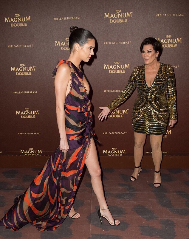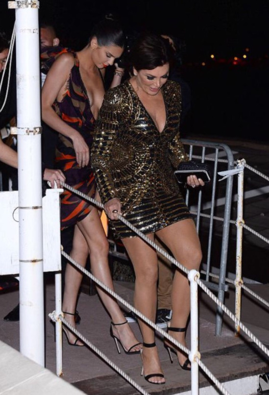 Kendall Jenner is a new face of Magnum Double! She rocked the carpet at the brand’s celebratory party in Cannes in a Versace multicolored gown, while momager Kris stuck by her daughter’s side in a $5,596 Balmain Black Gold Long Sleeve Embellished Dress: