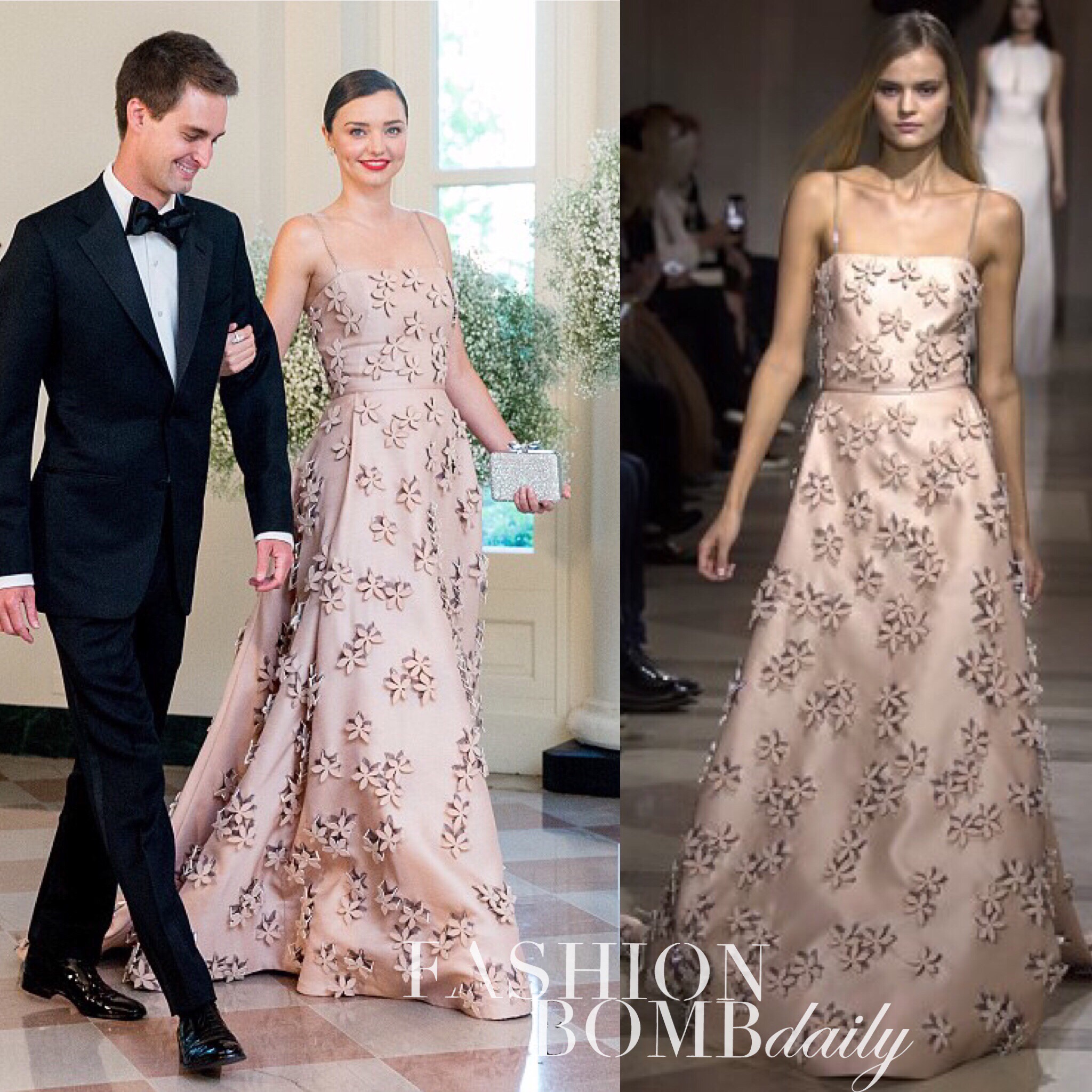 Miranda Kerr and boyfriend Evan Spiegal attended the White House State Dinner clad in style. For the festivities, she wore a Carolina Herrera Fall 2016 floral blush-toned dress: