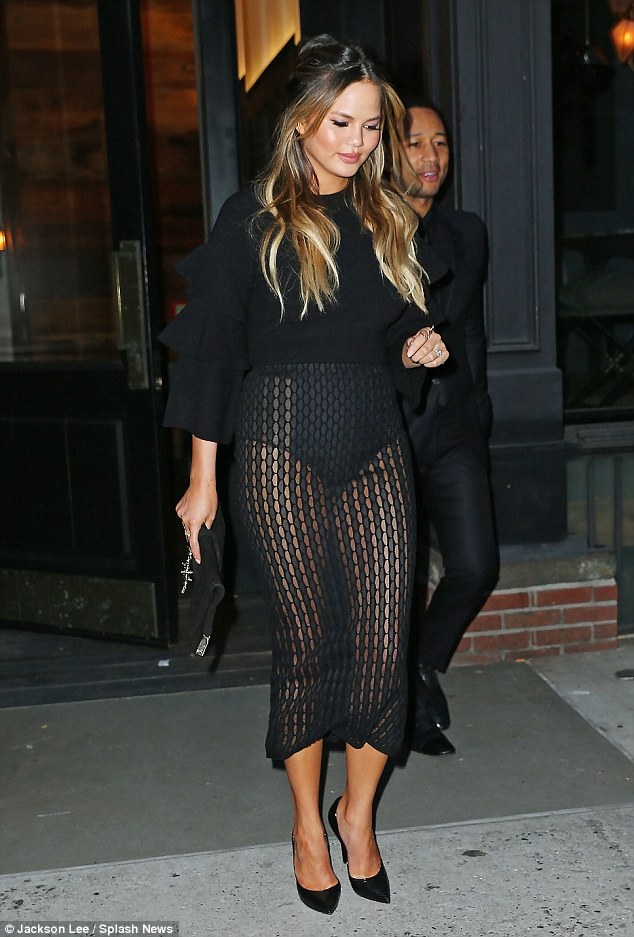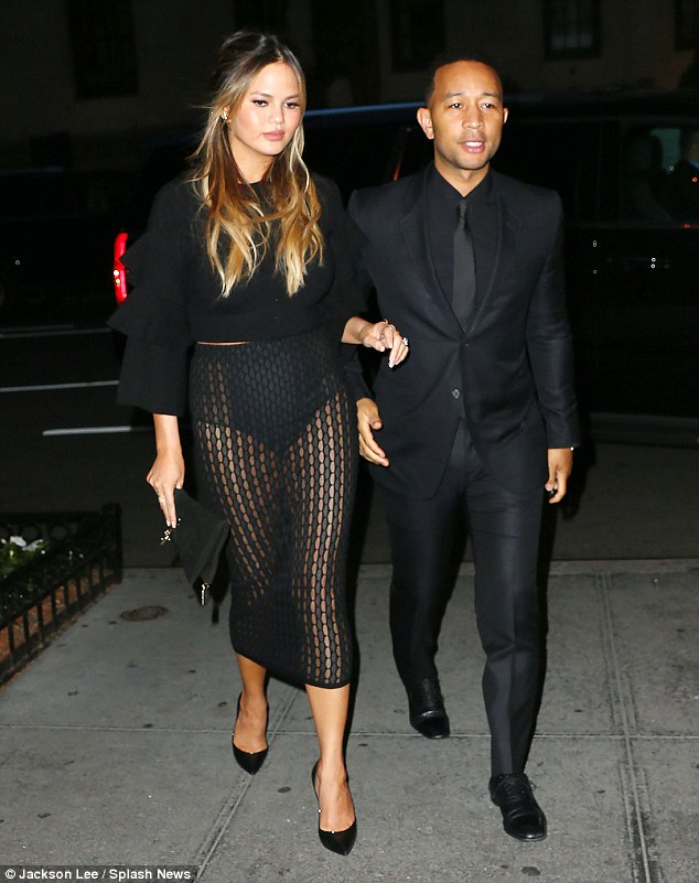 Chrissy Tiegen stepped out with husband John Legend for a night out on the town! For the night, she wore an Asilio The Label $180 Material Girl black top and the sheer $140 Knit skirt:
