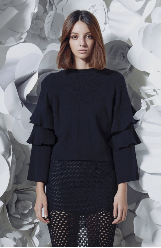 The blouse features a loose fit knit material, triple layered sleeves that detail two dramatic flare layers.