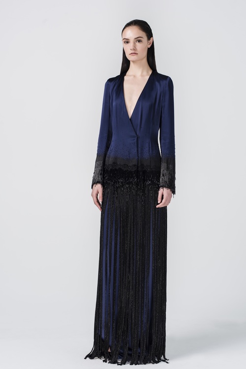 The satin navy dress features a plunging neckline, sparkle-tasseled sleeves and a heavily slashed hemline with a thigh-high slit.