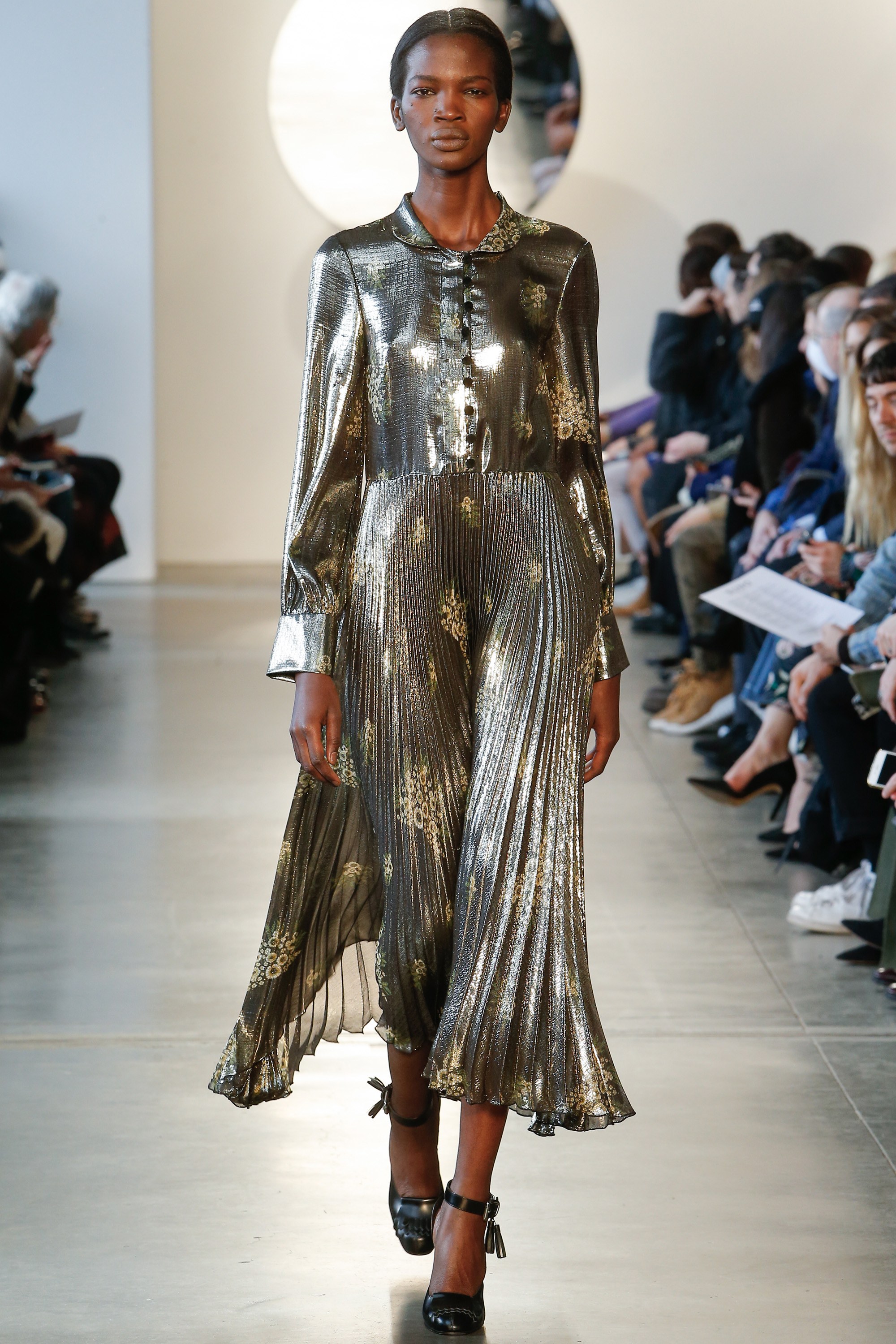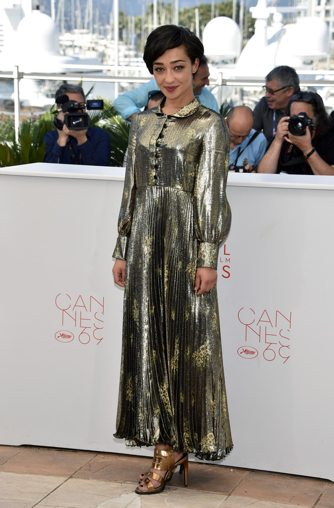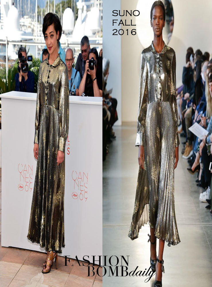 Ethiopian-Irish actress Ruth Negga couldn’t be missed at the Loving Cannes Film Festival Photocall, slipping on a Suno Fall 2016 Gold Metallic Pleated Dress:
