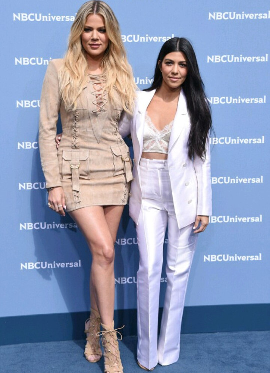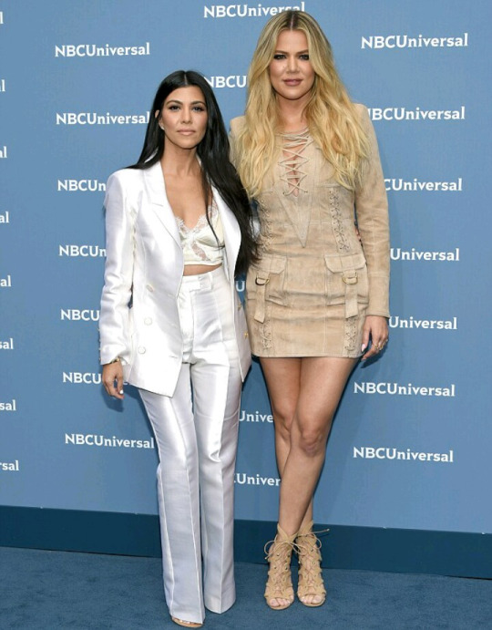 At any rate, Khloe Kardashian appeared with sister Kourtney at the NBC Universal upfronts in the same Balmain Resort 2016 suede lace up dress previously worn by Kate Bosworth: