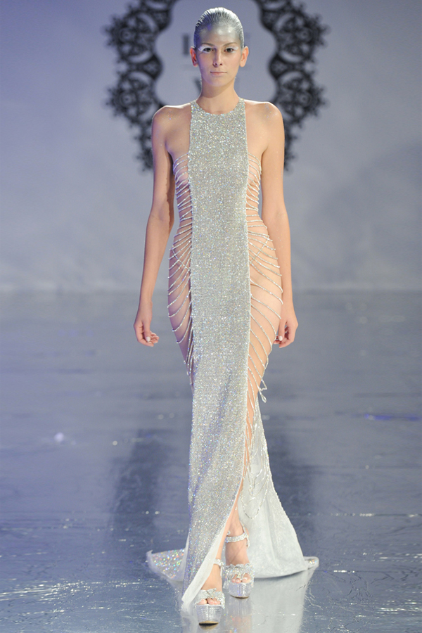 The silver, sparkly, sleeveless gown features sheer side panels on each side that connect the front of the dress to the back of the dress by draping jeweled links.