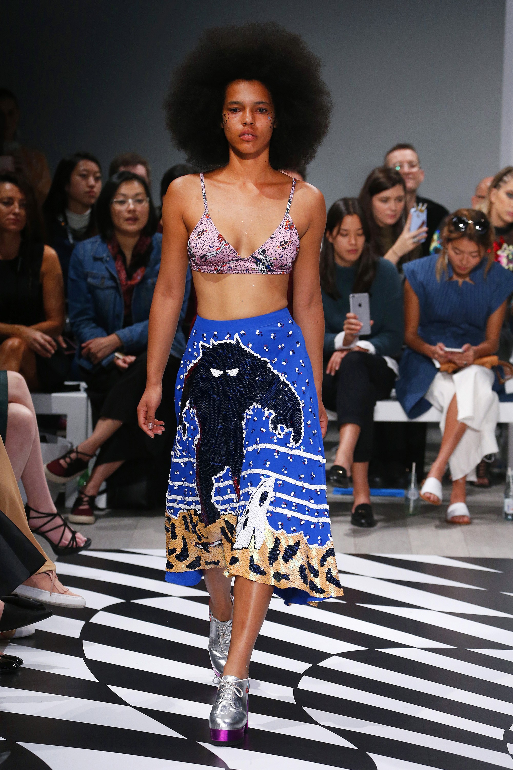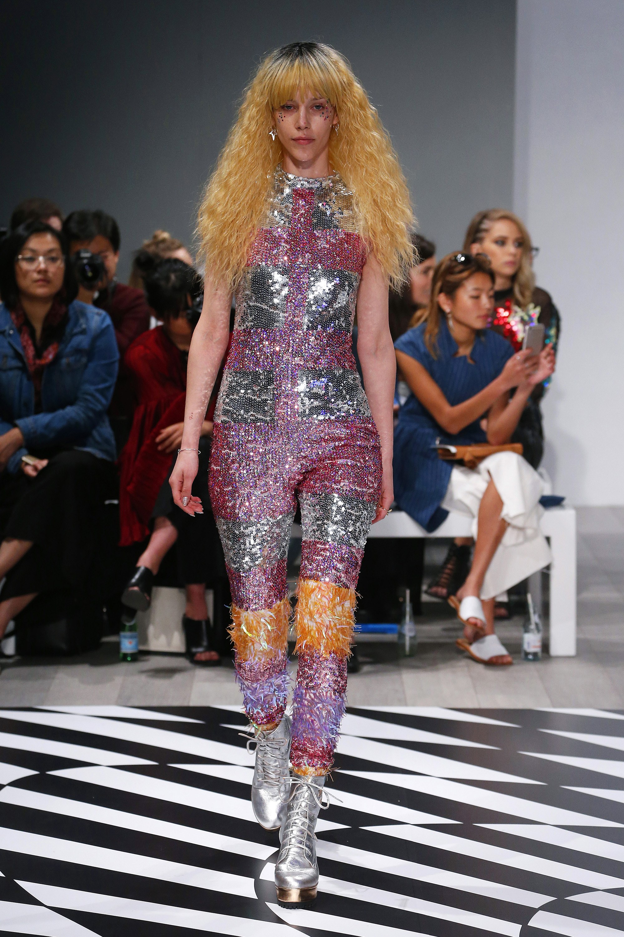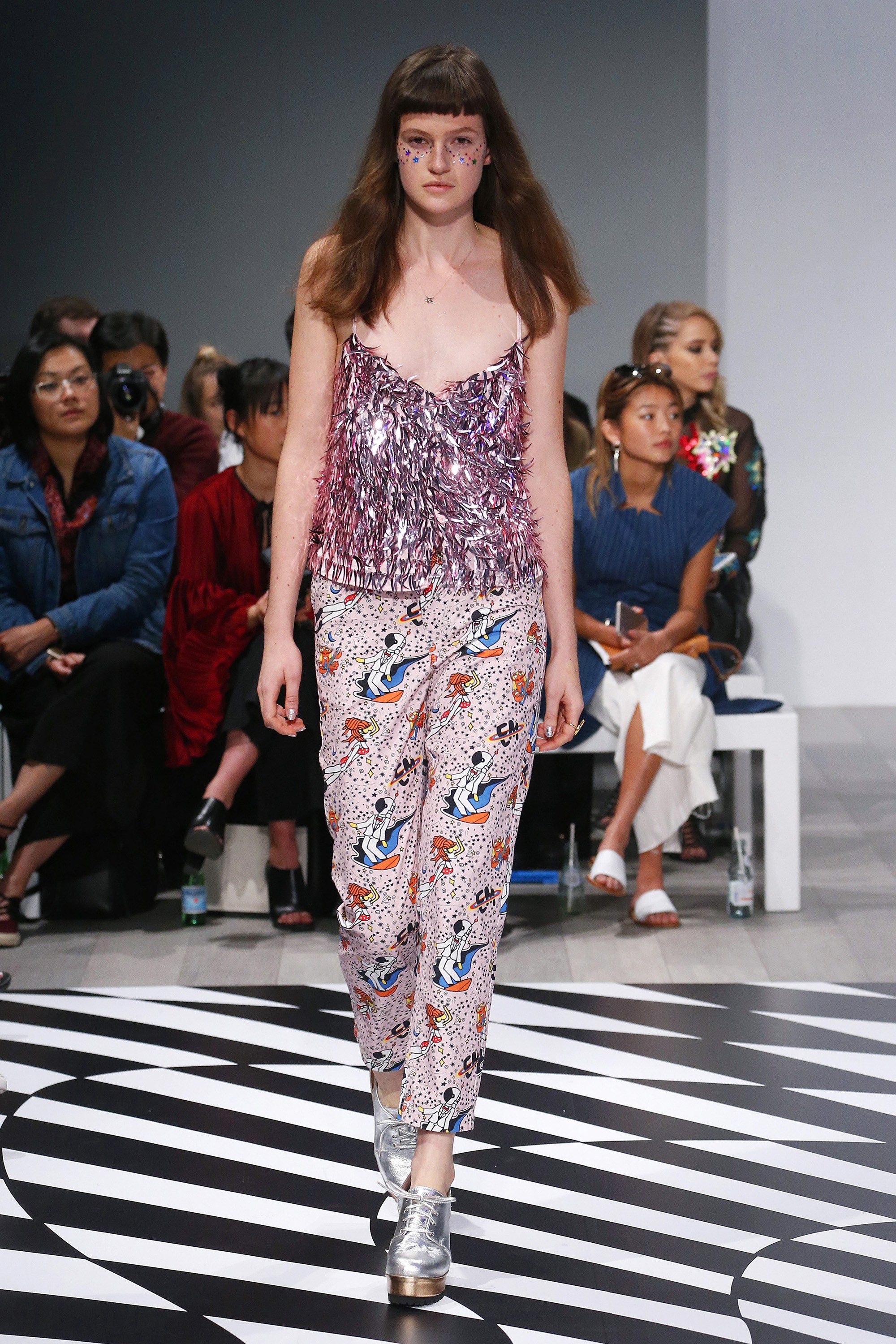 The assortment was brimming with glitter and sequins and gave an undeniable nod to Star Trek, as well as the late David Bowie’s iconic alter ego Ziggy Stardust. A model in a club-perfect, pink and silver embellished jumpsuit with a face adorned with glitter gave the Vulcan salute at the end of the catwalk—a topical choice given the fact that the saga’s next film hits theaters in July.