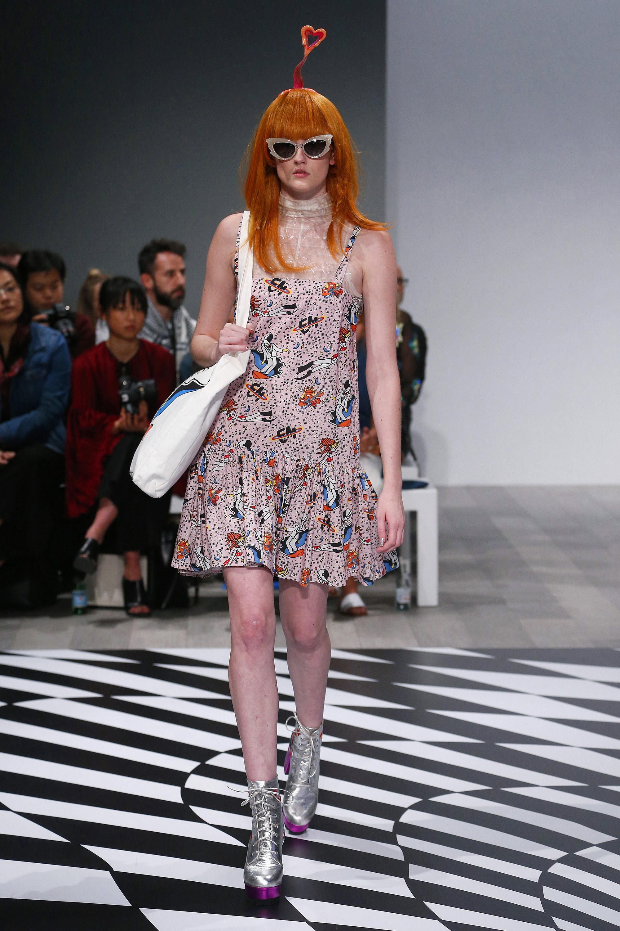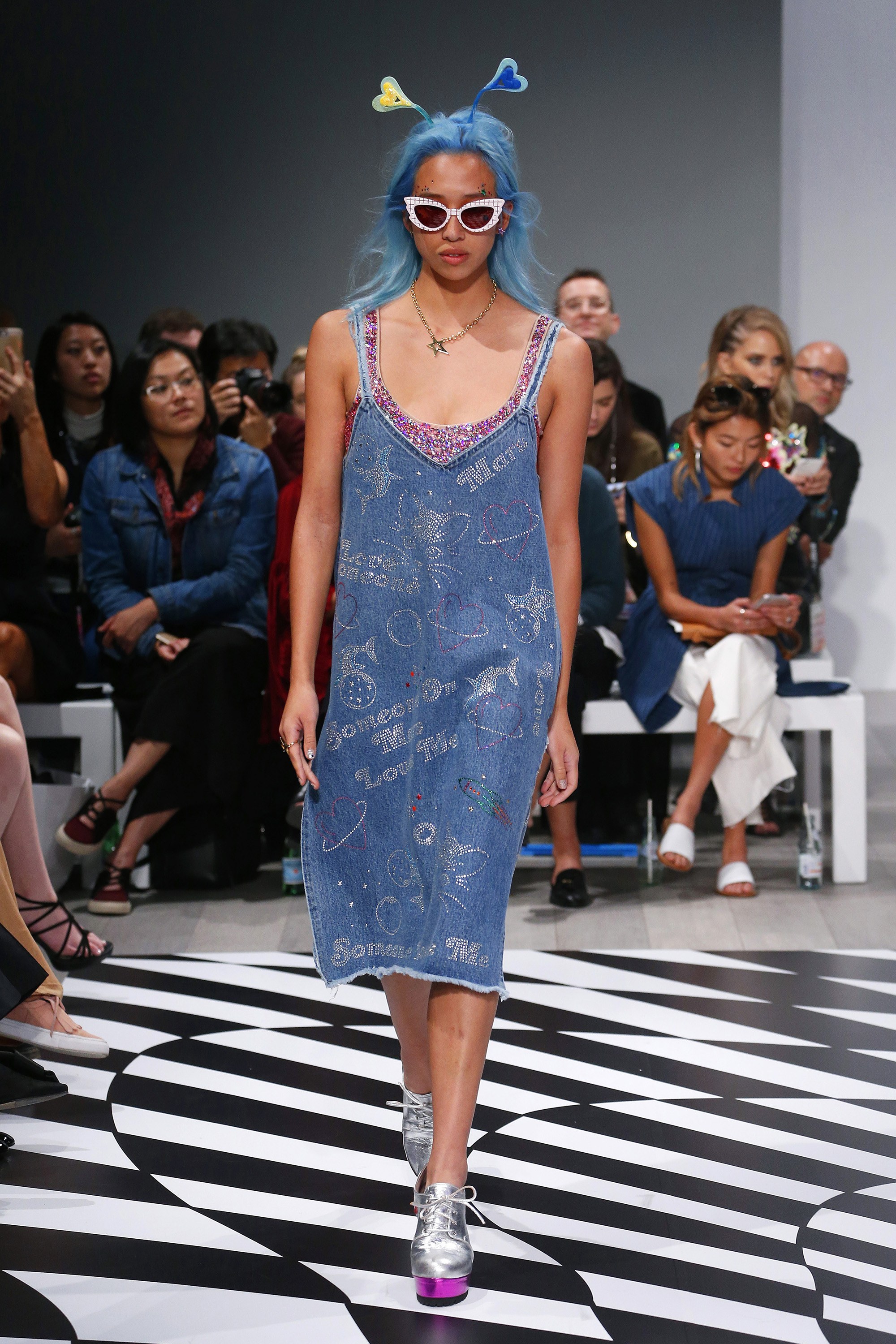 Accessories were just as funky and standout as the clothing: metallic, platform boots, alien antennae-inspired headbands, retro-inspired shades, and colorblock shoulder bags. Wigs were aplenty and overflowed with color.