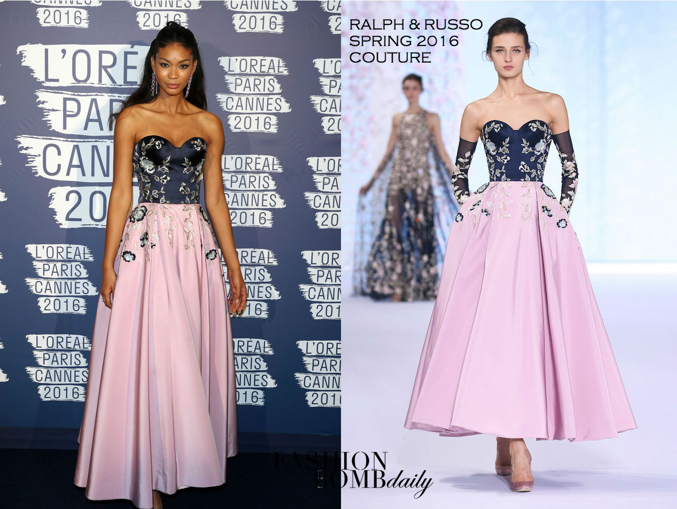 Chanel Iman was the belle of the ball at the L’Oreal Paris Blue Obsession Party in a Ralph & Russo Spring 2016 Couture Strapless Navy and Pink Floral Embroidered Gown: