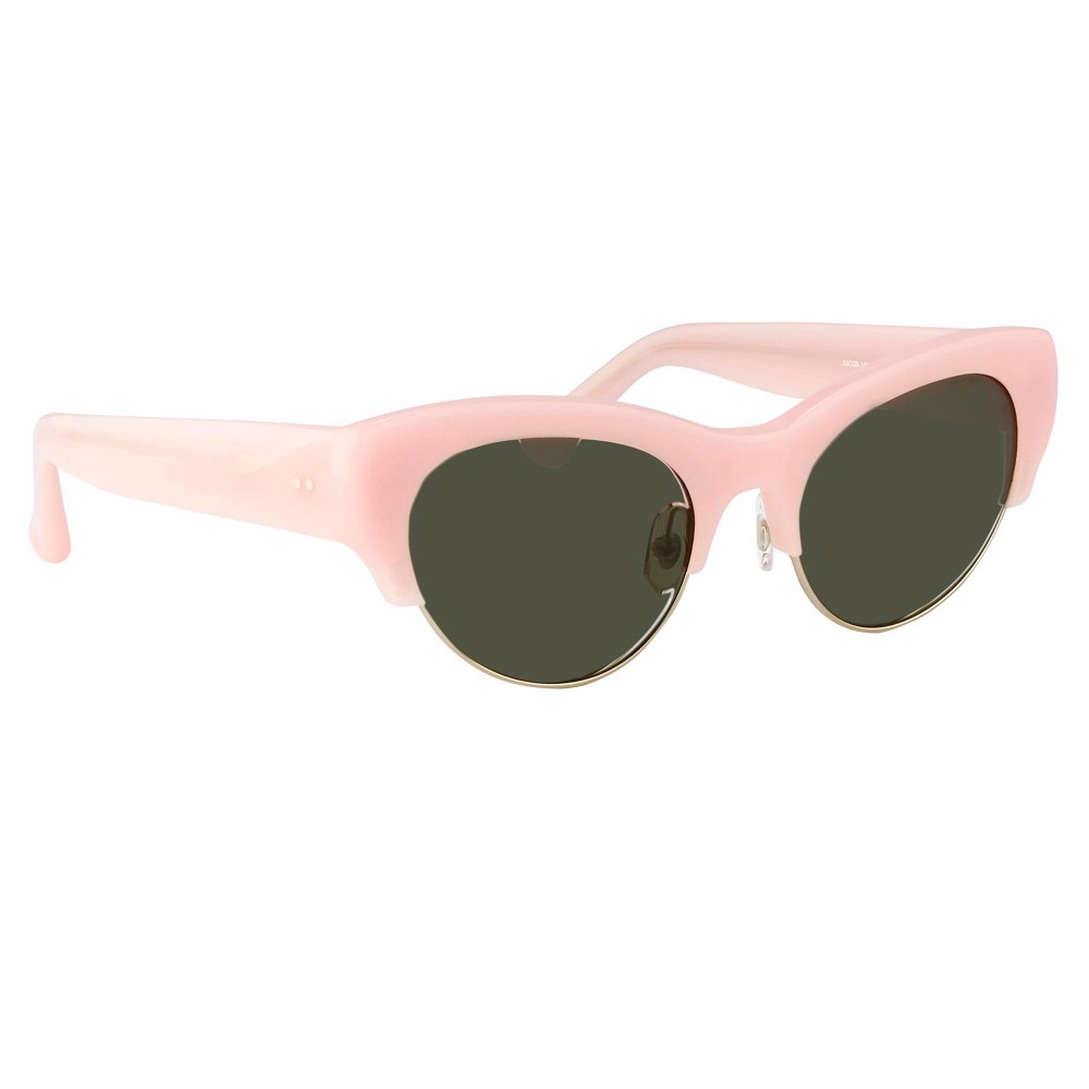 Her baby pink shades feature cat eye frames and green solid lenses.